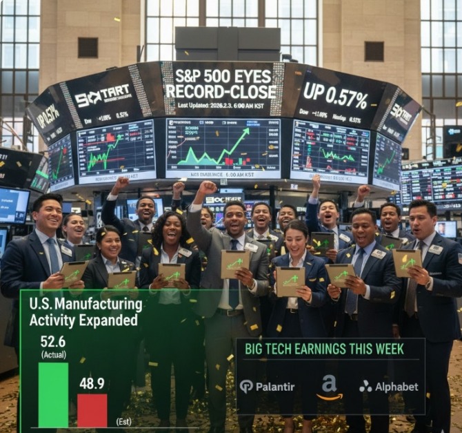 뉴욕 증시의 시선은 이제 본격적인 실적 발표로 향한다. 이번 주에는 인공지능 수혜주로 꼽히는 팔란티어(Palantir)를 비롯해 아마존(Amazon.com), 알파벳(Alphabet) 등 대형 기술주들의 실적 발표가 예정돼 있다. 시장 참여자들 사이에서는 제조업 지표가 던진 긍정적 신호가 빅테크 기업들의 실적 확인을 거쳐 증시의 추가 동력(Momentum)으로 이어질지에 주목하고 있다.