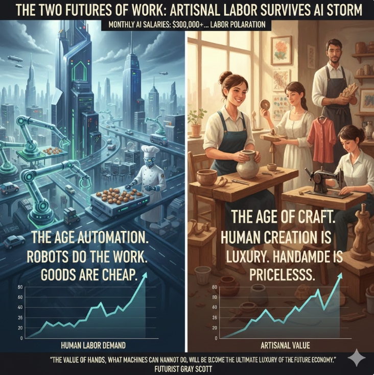 모든 것이 자동화되는 세상에서 인간은 역설적으로 '기계가 할 수 없는 일'로 회귀한다. 스콧은 미래 경제에서 손으로 직접 만든 제품이 가장 가치 있는 '사치품' 지위에 오른다고 분석했다. 인위적인 대량 생산 제품이 흔해질수록 인간의 지문과 정성이 담긴 수공예품과 예술 창작물의 희소성이 극대화된다는 논리다.