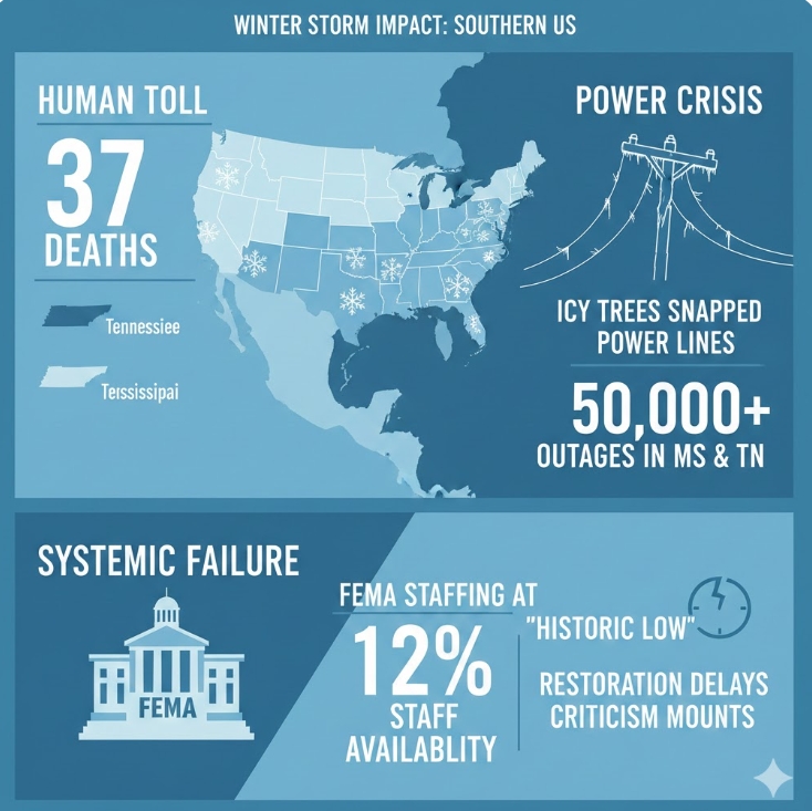 미 연방재난관리청(FEMA)이 지난 1일 발표한 운영 브리핑 자료를 보면, 이번 겨울 폭풍으로 인한 사망자는 테네시주 21명, 미시시피주 16명 등 총 37명에 이른다. 전력 분석 매체 파워아우티지(PowerOutage.us) 집계 결과, 지난 2일 오전 기준으로 미시시피주 5만여 가구와 테네시주 2만8000여 가구에 여전히 전기가 공급되지 않고 있다.