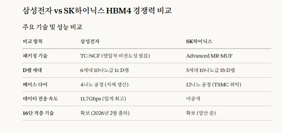 삼성전자는 지난달 29일 실적 발표에서 HBM4 양산에 이미 들어갔으며 이달부터 본격 출하를 시작한다고 밝혔다. 김재준 삼성전자 메모리사업부 부사장은 "열압착 비전도성 필름(TC-NCF) 기반 16단 HBM4 적층 기술을 양산 수준으로 확보했다"면서 "고객 수요에 즉시 대응할 수 있다"고 말했다. SK하이닉스는 어드밴스드 MR-MUF 패키징 기술과 5세대 10나노급 1b D램을 활용해 16단 HBM4 개발을 마쳤다.