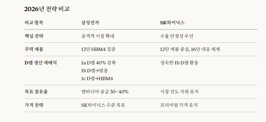 삼성전자는 HBM4를 올해 수익 구조를 바꾸는 수단으로 삼았다. 12단 HBM4 제품에 집중해 마진을 높이고, 엔비디아 HBM4 공급에서 점유율을 30~40%로 끌어올려 가격도 SK하이닉스 수준을 목표로 한다. 삼성전자는 4세대 1a D램 생산량을 40% 줄이고, 5세대 1b D램은 범용 제품에, 1c D램은 HBM4에 배정하는 방식으로 생산 역량을 재배치했다.