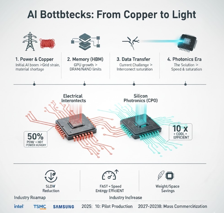지난 3년간 엔비디아의 GPU(그래픽처리장치)가 AI 시대를 열었지만, 정작 데이터센터 현장에서는 "데이터를 실어 나를 길이 막혔다"는 비명이 터져 나온다. 지금까지는 정보를 전기 신호에 담아 구리선으로 보냈으나, 처리할 정보가 너무 많아지자 구리선에 과부하가 걸린 탓이다.