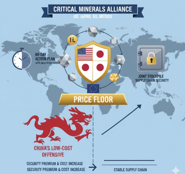 USTR은 멕시코와 함께 핵심 광물 수입 시 일정 가격 이하로 떨어지지 않도록 보장하는 '가격 하한제'를 구체화한다. 이는 특정 국가가 물량을 쏟아내 가격을 폭락시키는 시장 교란 행위를 막고, 우방국 내 채굴·가공 기업의 최소 수익성을 보장하려는 장치다.