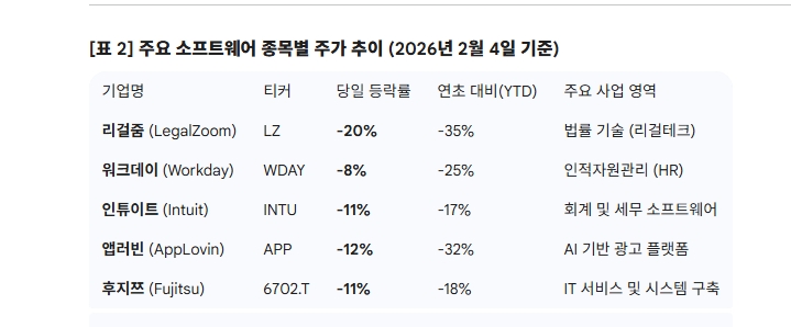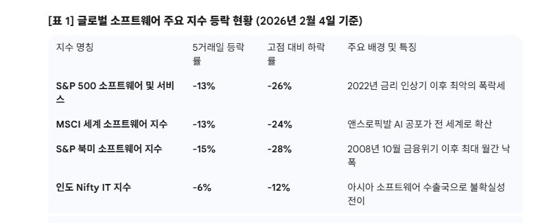 시장에서는 이를 AI가 기존 서비스형 소프트웨어(SaaS) 기업의 영역을 직접 침탈하는 신호로 받아들였다. 실제로 S&P 500 소프트웨어 및 서비스 지수는 최근 5거래일 동안 13% 급락했으며, 이는 10월 정점 대비 26% 하락한 수치다. 같은 기간 S&P 500 지수가 사상 최고치를 기록하며 상승한 것과 비교하면 소프트웨어 업종의 소외 현상은 더욱 두드러진다.