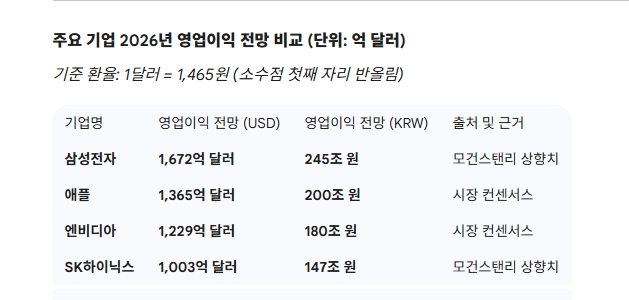 KB증권은 삼성전자가 2026년 170조 원의 영업이익을 달성해 엔비디아, 아람코, 애플 등과 함께 글로벌 영업이익 'TOP 6'에 진입할 것으로 분석했다. 특히 SK하이닉스는 고대역폭메모리(HBM) 시장 선점 효과 덕분에 지난해 연간 영업이익 47.2조 원을 기록하며 사상 처음으로 삼성전자(43.6조 원)를 앞지르는 실적 역전 현상을 보였다.