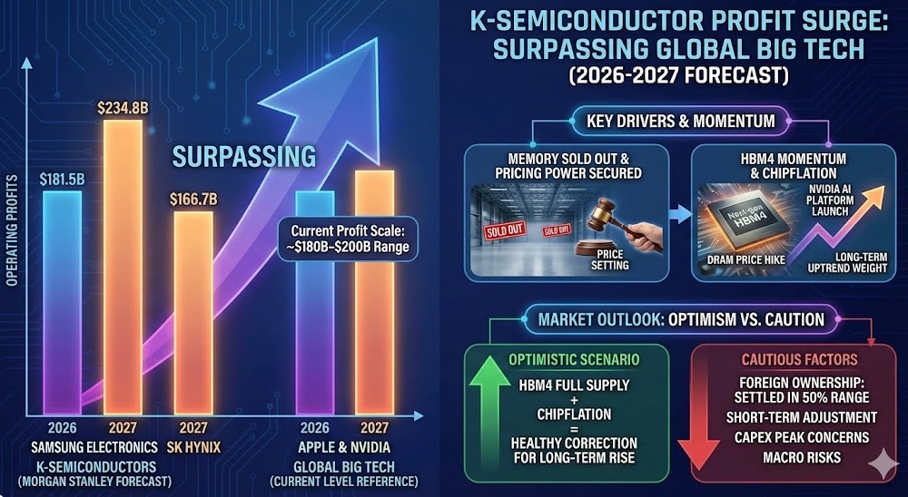 해외 투자은행과 시장 컨센서스에 따르면, 국내 반도체 기업들의 이익 체력은 이미 세계 최상위권 수준으로 올라섰다. 모건스탠리는 삼성전자의 2026년 영업이익을 1815억 달러(약 265조 원), 2027년에는 2348억 달러(약 344조 원)에 이를 것으로 예측했다. SK하이닉스 또한 2027년 1667억 달러(약 244조 원)의 이익을 거둘 것으로 분석했다. 이는 현재 글로벌 시가총액 상위권인 180조~200조 원에 달하는 애플과 엔비디아의 이익 규모를 뛰어넘는 수치다.
