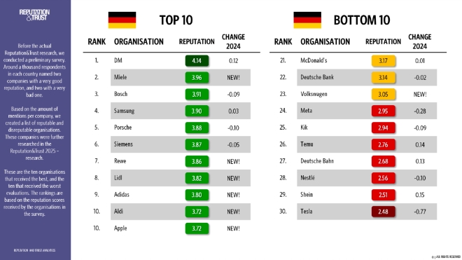 조사에 따르면 테슬라는 독일에서 평가 대상이 된 30개 기업 가운데 최하위인 30위를 기록했다. 테슬라의 종합 평판 점수는 5점 만점에 2.48점으로, 조사 기준상 ‘매우 나쁨’으로 분류되는 2.5점 미만에 해당한다.