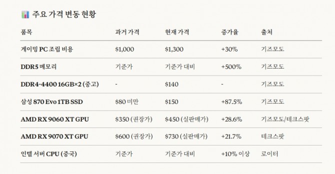 DDR5 메모리 500% 급등에 게이밍 PC 조립비용 1,300달러로 30% 상승