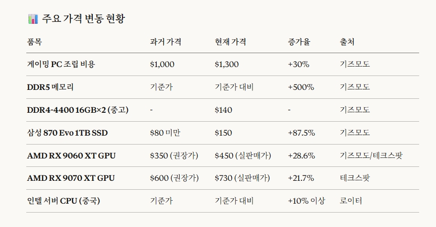 기술 매체 기즈모도는 8일 2026년 기준 가성비 게이밍 PC 조립 비용 분석 기사를 통해 시장 상황을 구체적으로 전했다. 몇 달 전만 해도 1000달러(약 146만 원) 미만으로 조립 가능했던 PC가 현재 동급 부품 기준 약 1300달러(약 190만 원)에 이르며 30% 가까이 상승했다.
