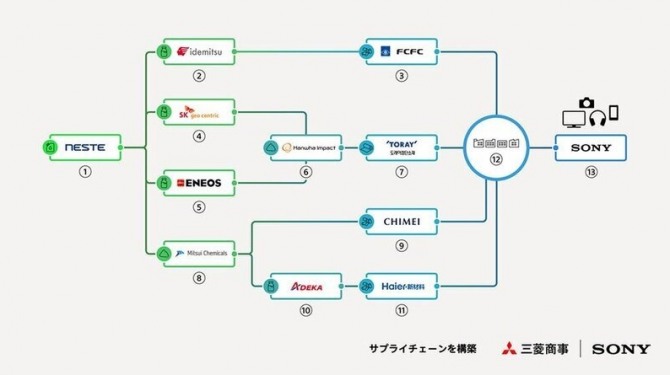 이미지 확대보기9일 일본공업신문 등에 따르면 소니, 미쓰비시상사, ENEOS, 이데미쓰코산, 미쓰이화학, 도레이 등 14개사는 세계 최초로 소니의 오디오·비주얼 제품 등 고기능 제품에 사용 가능한 재생 가능 플라스틱을 제조하는 글로벌 공급망을 5개 국가·지역에 걸쳐 공동 구축했다고 밝혔다.