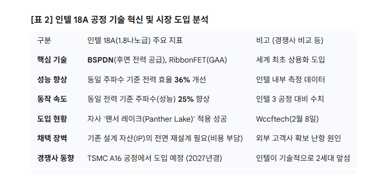 삼성전자와 TSMC가 BSPDN 도입을 2020년대 후반으로 늦추며 기존 설계 자산(IP)을 활용할 수 있는 안정적 전략을 취한 것과 대조적이다. TSMC는 1.6나노급인 A16 공정에서나 이 기술을 도입할 예정인데, 이는 인텔보다 두 세대나 늦은 시점이다. 하지만 현재 파운드리 고객들은 기술적 우위보다 설계의 연속성과 공정 이동의 편의성을 더 중시하며 인텔 채택을 주저하고 있다.