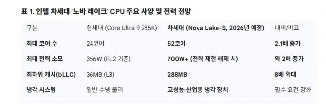 현재 인텔의 최상위 모델인 코어 울트라 9 285K가 최대 356W를 사용하고, 전력 소모가 많기로 이름난 i9-14900K가 548W를 기록했던 것과 비교하면 1.3배에서 2배 가까이 급증한 수치다. 업계는 이를 두고 “소비자용 CPU의 범주를 벗어난 무리한 모험”이라는 평가를 내놓고 있다.