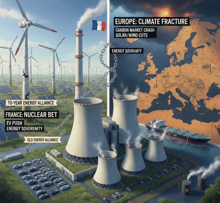 하지만 프랑스는 "이미 원자력이라는 깨끗하고 싼 전기가 있는데, 왜 굳이 비싼 비용을 들여가며 풍력·태양광에만 매달려야 하나"라며 독자 노선으로 선회했다. 프랑스가 저렴한 원전 전기를 대량 생산하면, 비싼 비용을 들여 신재생에너지로 전환 중인 독일 등 주변국 기업들보다 가격 경쟁력에서 앞서게 된다. 결국 "다 같이 신재생으로 가자"는 약속이 깨지고, 나라마다 자국에 유리한 에너지를 쓰겠다며 각자도생하는 상황이 벌어지는 것이다.