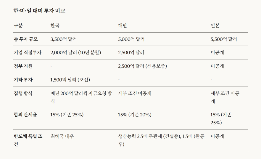 한국은 3500억 달러(약 506조 원), 일본은 5500억 달러(약 795조 원) 규모의 대미 투자를 조건으로 각각 25%였던 상호관세를 15%로 낮췄다. 한국의 경우 3500억 달러 중 2000억 달러(약 289조 원)는 매년 200억(약 28조 원) 달러씩 10년에 걸쳐 자금요청(capital call) 방식으로 집행되고, 나머지 1500억 달러(약 216조 원)는 조선 협력 투자로 구성됐다. 대만의 경우 총액이 5000억 달러로 제시됐지만, 한국과 같은 세부 집행 조건은 이번 발표에 포함되지 않았다.