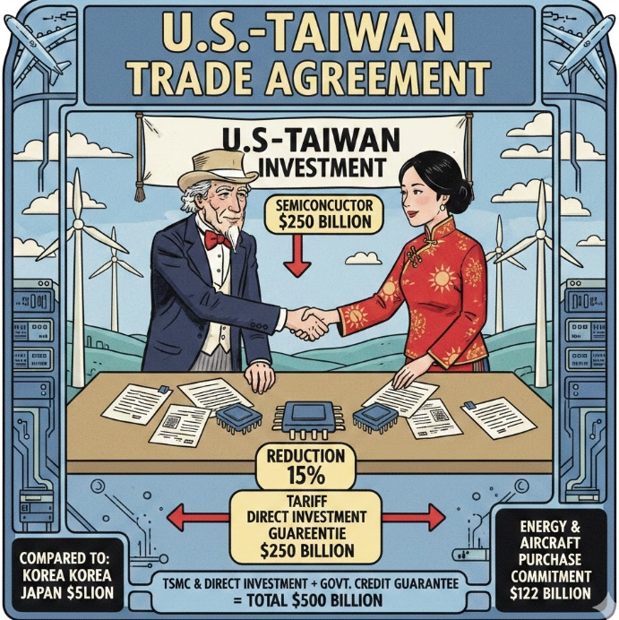 협정 전문에 따르면, 대만 반도체·기술 기업들은 미국 내 첨단 반도체·에너지·인공지능(AI) 생산 역량 구축에 2500억 달러를 직접 투자한다. 대만 정부는 이와 별도로 최소 2500억 달러 규모의 신용보증을 제공해 자국 기업 추가 투자를 촉진한다. 하워드 러트닉 미국 상무장관은 CNBC 인터뷰에서 기업 직접투자 2500억 달러와 정부 보증 2500억 달러를 합쳐 총 5000억 달러(약 723조 원) 규모라고 강조했다.