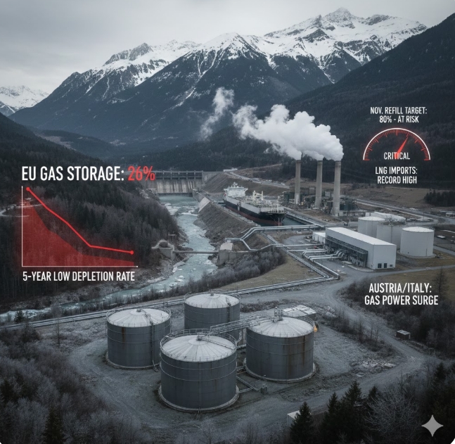 올해 들어 알프스 강설량과 적설 범위가 평년을 크게 밑돌고 있다. 알프스는 오스트리아와 이탈리아 북부 수력발전의 핵심 수원이다. 적설량 부족은 수력발전 감소를 초래하고, 이는 가스화력발전으로 대체되면서 천연가스 소비를 늘리는 악순환을 만들고 있다.