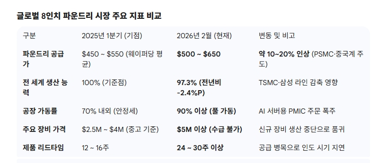 반면 수요는 정반대 흐름이다. AI 서버와 데이터센터에 들어가는 PMIC 주문이 쏟아지는 가운데, 중국의 반도체 자급자족 정책으로 현지 내수 물량까지 급증했다. 중국 파운드리 업체들은 지난해 하반기부터 공장 가동률이 급등하자 발 빠르게 가격 인상을 단행했다.