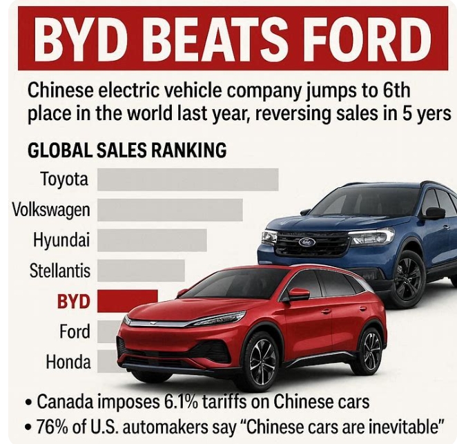 BYD는 2025년 전기차 판매에서도 225만대로 테슬라를 제쳤으며, 해외수출은 105만대로 전체 판매의 25%를 차지했다. 포드의 짐 팔리 최고경영자는 지난 10일 실적 발표에서 중국 자동차 산업을 전 세계 자동차업체가 대응해야 할 "와일드카드"라고 경고했다.