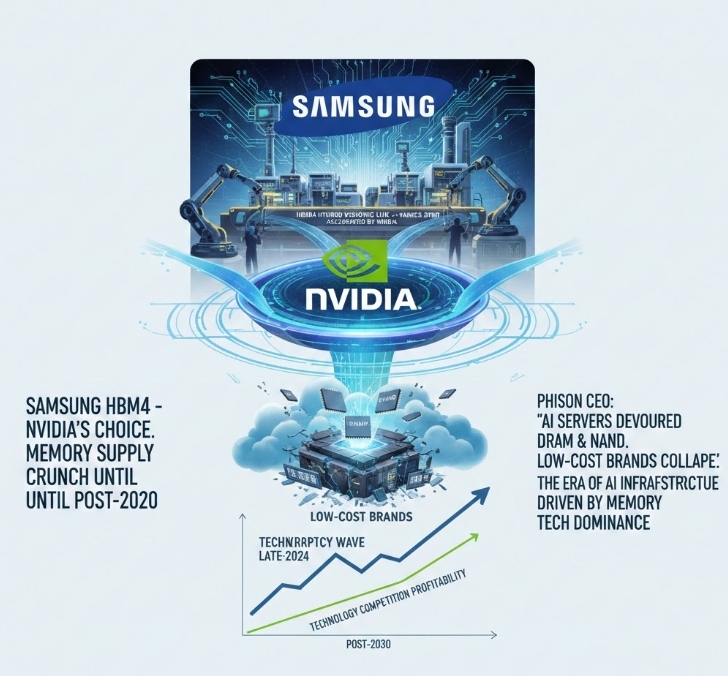 삼성전자가 오는 3월부터 충남 천안 캠퍼스에 6세대 고대역폭메모리(HBM4) 전용 하이브리드 본딩 라인 장비를 순차 도입한다. 이는 인공지능(AI) 반도체 시장에서 엔비디아의 독점적 수요가 메모리 제조사의 기술 개발 방향과 속도를 직접 결정하는 현실을 보여주는 장면이다. 공교롭게도 같은 날, 세계 낸드 컨트롤러 1위 기업 파이슨(Phison)의 최고경영자(CEO)AI 서버 수요가 D·낸드 공급을 통째로 잠식하면서 2030년 이후까지 공급난이 이어질 것이라고 경고했다.