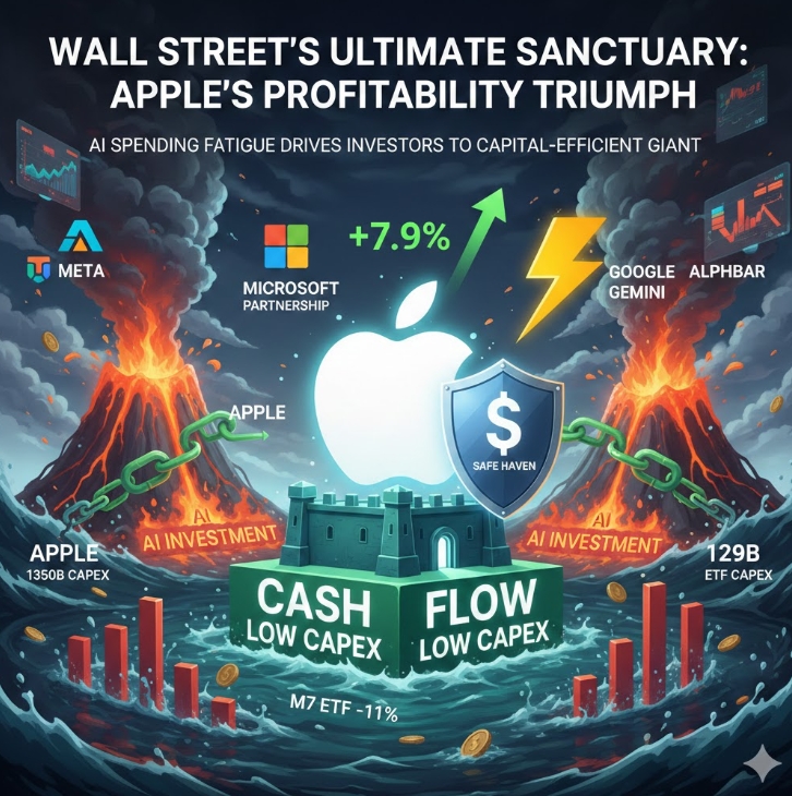 이미지 확대보기지난 17일(현지시각) 배런스 보도에 따르면, 천문학적인 자본을 투입하며 AI 패권 다툼을 벌이는 ‘매그니피센트 7(M7)’ 사이에서 애플이 유일한 ‘피난처’로 부상하고 있다. 수익 반환 시점이 불투명한 ‘AI 무한 경쟁’에 지친 투자자들이 탄탄한 현금 흐름과 낮은 설비투자 비용을 유지하는 애플의 실용주의 노선에 점수를 주기 시작했다는 분석이다.