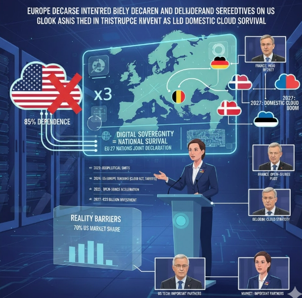 이미지 확대보기미국 빅테크 기업들이 유럽 클라우드 시장의 85%를 쥐고 있는 가운데, 유럽 각국 정부가 디지털 주권 확보를 국가 안보 차원의 최우선 과제로 올려놓고 자국산·오픈소스 기반 디지털 인프라 구축에 속도를 내고 있다.