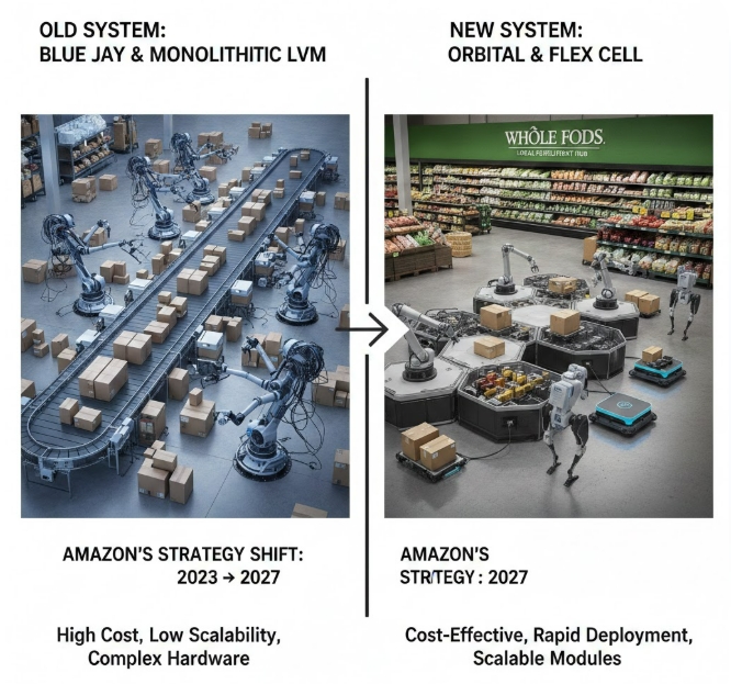 아마존은 기존의 거대하고 경직된 자동화 설비인 ‘모놀리식 LVM(Large Volume Mezzanine)’ 방식을 폐기하는 순서에 돌입했다. 대신 모듈화된 설비로 유연성을 높인 차세대 시스템 ‘오비탈’에 전사 역량을 집중한다.