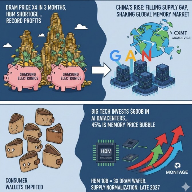 이미지 확대보기메타·아마존·구글·마이크로소프트 등 세계 최대 빅테크 기업들이 인공지능(AI) 데이터센터에 올해만 약 6000억 달러(약 873조 원)를 퍼붓기로 하면서 삼성전자와 SK하이닉스가 생산라인을 고대역폭메모리(HBM)에 전면 동원했기 때문이다. 차세대 게임 콘솔 출시는 2029년 이후로 밀릴 가능성이 나왔고, 이 틈을 중국 반도체 기업들이 파고들고 있다.