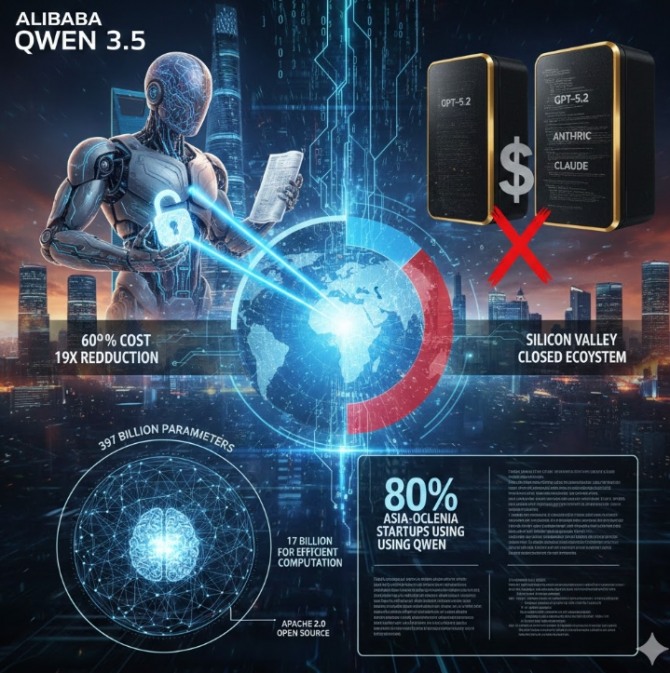 이미지 확대보기알리바바 클라우드가 지난 16일(현지시간) 전격 공개한 차세대 AI 모델 ‘큐원(Qwen) 3.5’는 성능 면에서 OpenAI의 GPT-5.2와 앤트로픽의 클로드를 위협하는 동시에, 운영 효율을 극대화하며 ‘AI 산업화’의 새로운 기준을 제시하고 있다. IT 전문 매체 퓨어PC와 업계 보도에 따르면, 이번 모델은 중국의 ‘AI+ 전략’을 상징하는 핵심 병기로서 글로벌 AI 생태계의 주도권을 실리콘밸리에서 아시아로 끌어오려는 포석으로 풀이된다.