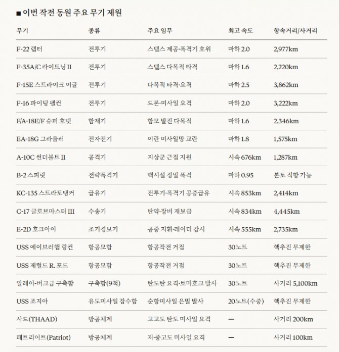 이번 이란 작전 동원 미군 주요 무기 제원. 도표=글로벌이코노믹