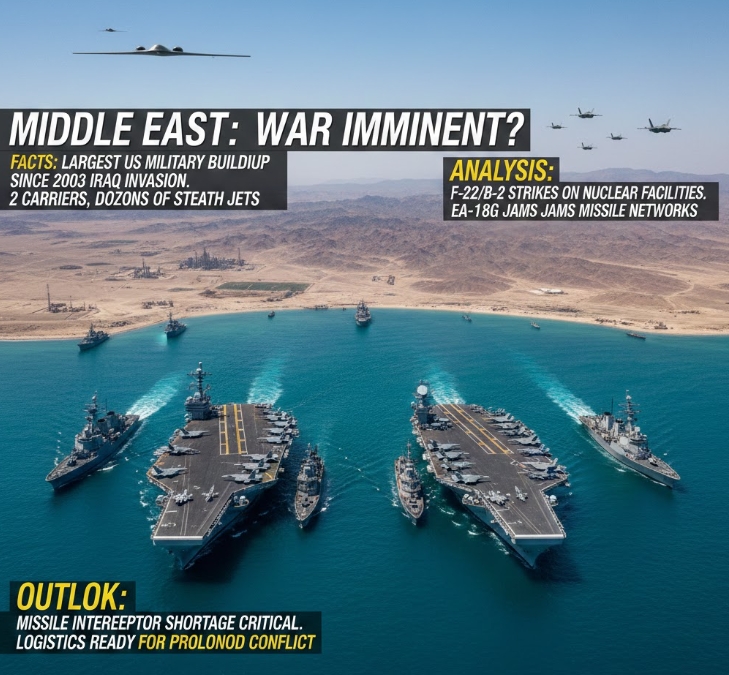 미국이 2003년 이라크 침공 이후 항공모함 2척, 구축함 9척, 스텔스 전투기 수십 대로 가장 큰 규모의 군사 전력을 중동에 집결시키고 있다. 이미지=제미나이3이미지 확대보기