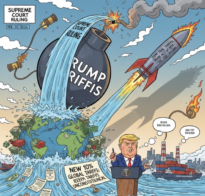 이미지 확대보기미국 연방대법원은 2026년 2월 20일(현지 시각) 도널드 트럼프 대통령이 국제긴급경제권법(IEEPA)을 근거로 부과한 전 세계 관세가 위헌이라고 6대3으로 판결했다. 트럼프 대통령은 판결 직후 기자회견에서 1974년 무역법 122조에 따라 10% 전 세계 일괄 관세를 행정명령으로 부과하겠다고 맞불을 놓았다. 이번 판결로 최대 1750억 달러(약 253조 원)에 이르는 관세 환급 청구 소송이 물밀듯 쏟아질 전망이라고 월스트리트저널과 배런스가 같은 날 오후 보도했다.