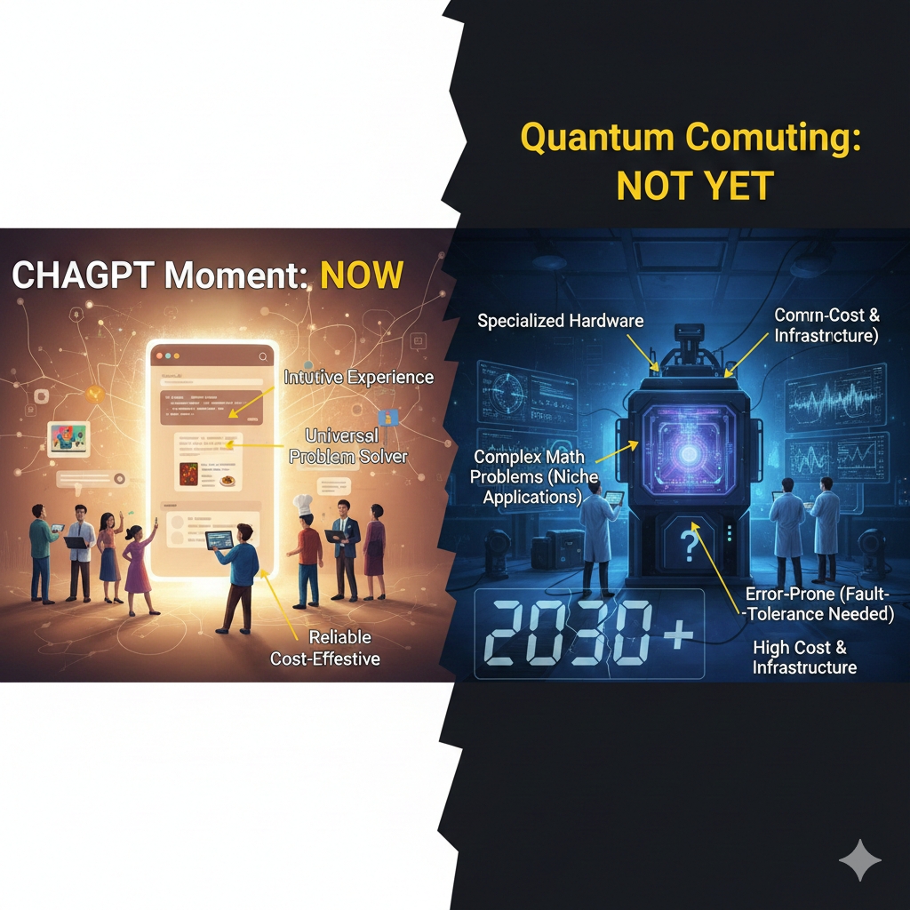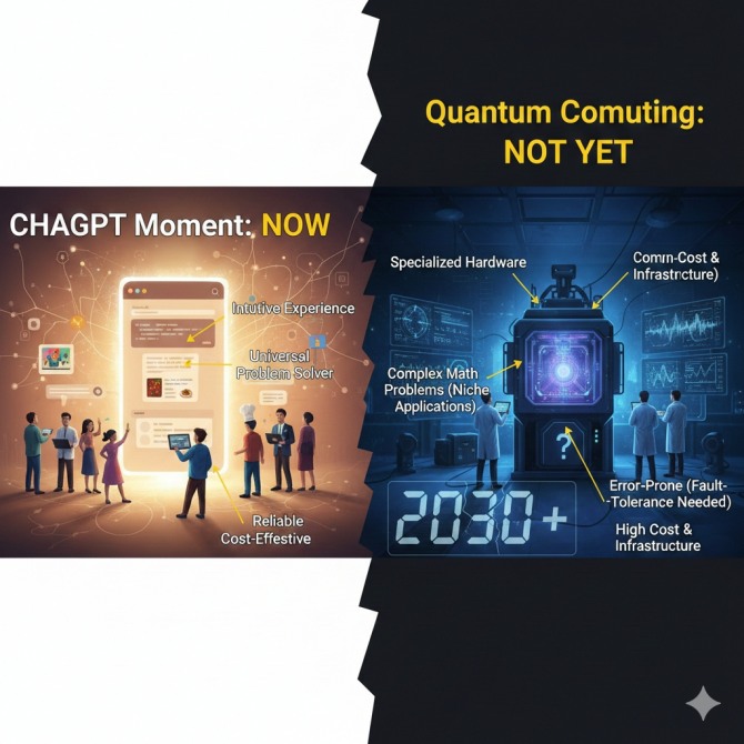 포브스에 따르면 양자 컴퓨팅이 챗GPT와 같은 파급력을 갖기 어려운 가장 큰 이유는 '범용성'의 차이다. 인공지능(AI)은 언어, 이미지, 코딩 등 일상 전반에 걸쳐 다재다능하게 쓰이지만, 양자 컴퓨팅은 수학적으로 극히 난해한 특정 문제 해결에만 특화되어 있기 때문이라는 것이다.