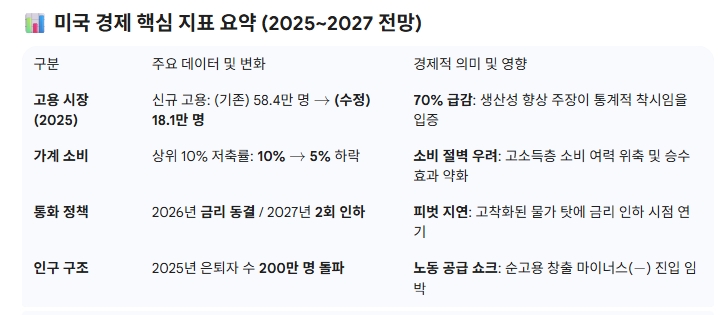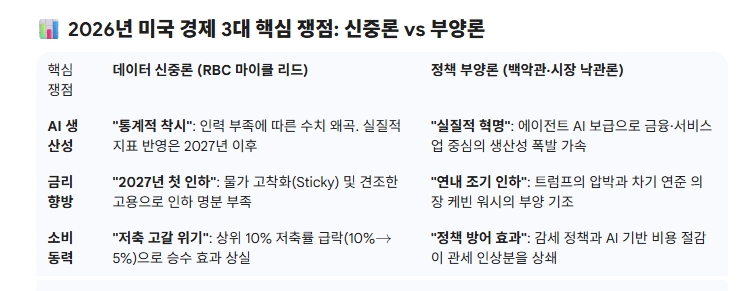 노동시장은 이제 '대량 해고'가 아닌 '자연 소멸'의 시대로 접어들었다. 2025년 한 해에만 200만 명의 베이비부머가 은퇴하며 순고용 창출은 마이너스 진입 직전이다. 리드 책임자의 통찰대로 2026년은 인력난과 고금리를 견뎌야 하는 '인내의 시기'가 될 것인가, 아니면 AI가 부르는 '착한 디플레이션'이 관세 충격을 이겨내고 조기 금리 인하를 이끌어낼 것인가를 두고 어디로 갈지 길목에 서 있는 시점이다.