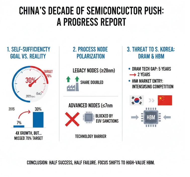 이미지 확대보기중국이 2015년 '반도체 굴기'를 선언한 '중국제조 2025(MIC2025)' 계획의 시한이 지났다. 결론은 절반의 성공이자 절반의 실패다. 미국 정보기술(IT) 전문매체 탐스하드웨어(Tom's Hardware)는 지난 21일(현지시각) '중국의 10년 반도체 추진 현황' 보도에서 중국이 성숙 공정 분야에서는 뚜렷한 성과를 거뒀지만, 첨단 노드에서는 사실상 한계에 도달했다고 분석했다. 미국 의회·행정위원회(USCC)도 지난해 11월 발표한 '중국제조 2025 이행 평가 보고서'에서 중국의 반도체 국내 조달 비중이 2025년 말 기준 약 30%에 그칠 것으로 추산했다.