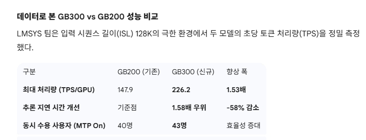 이번 결과에서 가장 주목할 부분은 소프트웨어 보정 기술인 다중 토큰 예측(MTP) 없이도 압도적인 성능을 냈다는 점이다. 기존 GB200의 경우 MTP를 적용해야만 성능이 169.1 TPS까지 올라가며 부족한 하드웨어 역량을 보완했다. 반면 GB300은 보정 기법 없이도 226.2 TPS를 기록하며 하드웨어 자체의 설계 완성도를 과시했다.