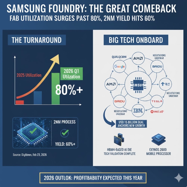 더 주목할 대목은 퀄컴·AMD·구글이 2나노 AI칩 생산을 삼성과 논의 중이라는 점이다. Wccftech와 탐스 하드웨어 등 보도에 따르면 삼성은 구글, AMD와 2나노 AI칩 생산을 협의하고 있으며, 퀄컴도 차세대 모바일 AP의 2나노 위탁 생산을 검토하고 있다. 퀄컴이 대규모 위탁 생산을 결정하기 위한 기준 수율로 70%를 요구하고 있다는 관측도 나온다. 삼성은 올해 2나노 관련 주문이 지난해보다 30% 이상 늘어날 것으로 보고 있으며, 미국 텍사스 테일러 공장도 올해 가동에 들어갈 예정이다.
