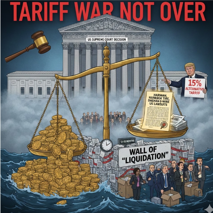 대법원 판결 이전부터 발 빠르게 움직인 기업들이 있다. 국내 보도를 종합하면, 삼성전자 자회사 하만(Harman)의 미국 법인은 올해 1월 7일 미국 정부를 상대로 IEEPA 관세 무효 및 소급 환급 청구 소송을 CIT에 접수했다. 한국타이어와 대한전선의 미국 법인도 미국 관세 전액 환급을 요구하는 소송을 제기한 상태다. 이들 소송은 대법원 판결 전까지 자동 정지됐으나 판결을 계기로 절차가 재개됐다.