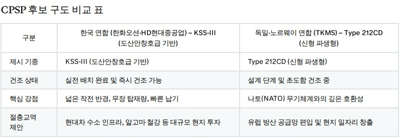 반면 한국의 KSS-III(도산안창호급)는 이미 한국 해군에서 실전 운용되며 태평양과 대서양을 아우르는 대양 작전 능력을 완벽하게 입증했다. 코플랜드 CEO는 KSS-III에 대해 "직접 걸어 들어가 만져보고 눈으로 확인할 수 있는 준비된 전력"이라고 자신감을 내비쳤다. 한국 측 제안대로라면 2032년에 초도함을 인도하고 2035년까지 4척, 2042년까지 전체 12척의 인도를 모두 마칠 수 있다. 노후화된 빅토리아급 잠수함의 잦은 고장으로 전력 공백에 시달리는 캐나다 해군으로서는 가장 매력적인 조건이다.