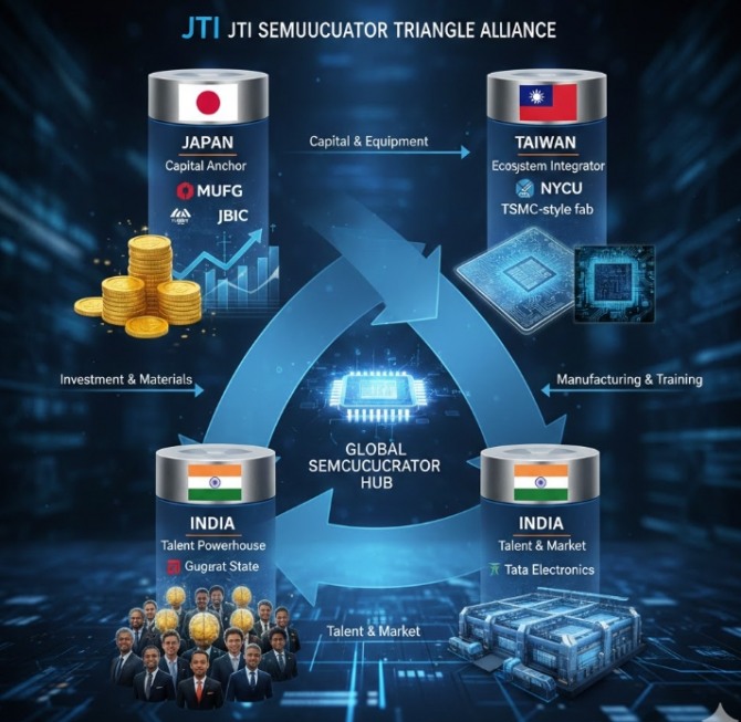 이미지 확대보기일본 최대 금융그룹 미쓰비시UFJ(MUFG)은행과 대만 반도체 인재 사관학교인 국립 양밍차오퉁대학교(NYCU)는 지난 24일(현지시각) 신주에서 반도체 산업 협력을 위한 업무협약(MOU)을 공식 체결했다. 대만 디지타임즈 보도를 통해 알려진 이 협약은 단순한 양자 협력의 외양을 띠지만, 속내는 전혀 다르다. 일본이 자금줄을 쥐고, 대만이 기술 생태계를 통합하며, 인도가 인력을 공급하는 이른바 'JTI(Japan-Taiwan-India) 삼각동맹'의 제도적 출범 선언이라는 것이 업계의 지배적 분석이다.