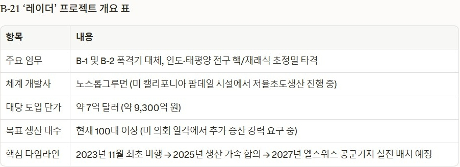 25일(현지 시각) 워싱턴 외교·안보 소식통과 미 공군의 공식 발표를 종합하면, 미 공군은 최근 방산업체 노스롭그루먼과 B-21 폭격기의 생산 물량을 대폭 확대하는 내용의 신규 합의를 맺었다. 이를 위해 미 의회가 통과시킨 2025년 예산 조정 패키지에서 무려 45억 달러(약 6조 4000억 원)라는 막대한 자금이 B-21 프로그램에 긴급 수혈된다.