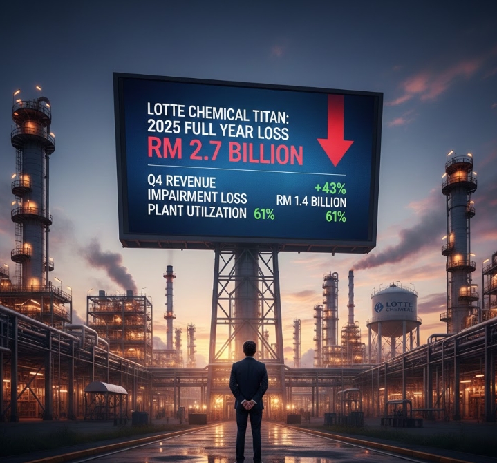 이미지 확대보기롯데케미칼 타이탄 홀딩스(LOTTE Chemical Titan Holding Berhad)가 지난 25일(현지시간) 공시한 연간 실적에 따르면, 2025년 세전손실은 27억 5,600만 링깃(약 1조 108억 원)으로 전년(15억 6,900만 링깃, 약 5,754억 원)보다 75.6% 급증했다. 현지 경제매체 비즈니스 투데이가 이를 보도했다.