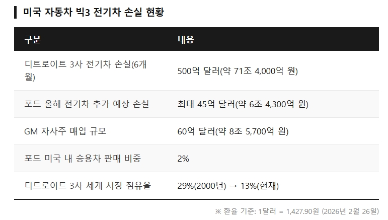 그러나 그 낙관론 뒤편의 실상은 냉엄하다. 영국 파이낸셜타임스(FT)는 26일(현지시각) GM·포드·스텔란티스 등 디트로이트 3사가 지난 6개월 사이 전기차 개발·생산 부문에서만 500억 달러(약 71조4000억 원)에 달하는 손실을 장부에 반영했다고 보도했다. 포드는 올해 전기차 부문에서만 최대 45억 달러(약 6조4300억 원)의 추가 손실을 예상하고 있다. 주가 상승이라는 단기 처방 이면에서 구조적인 출혈은 멈추지 않고 있다는 뜻이다.