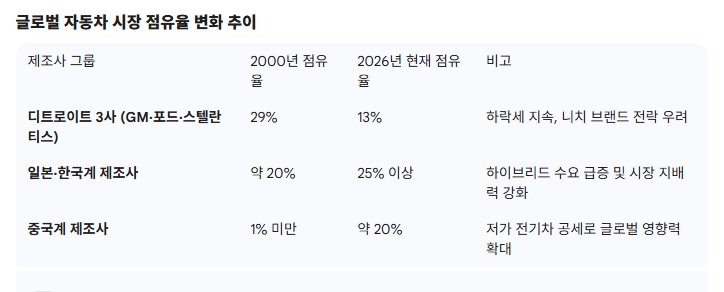 디트로이트의 위기는 현대차·기아에 도전이자 기회다. 미국 자동차 통계분석기관인 GCBC에 따르면 현대차그룹은 2025년 미국에서 현대차 90만1686대, 기아 83만6802대 등 합산 183만6172대를 판매하며 역대 최고 기록을 갈아치웠고, 시장 점유율도 11.3%로 사상 최고치를 기록했다.