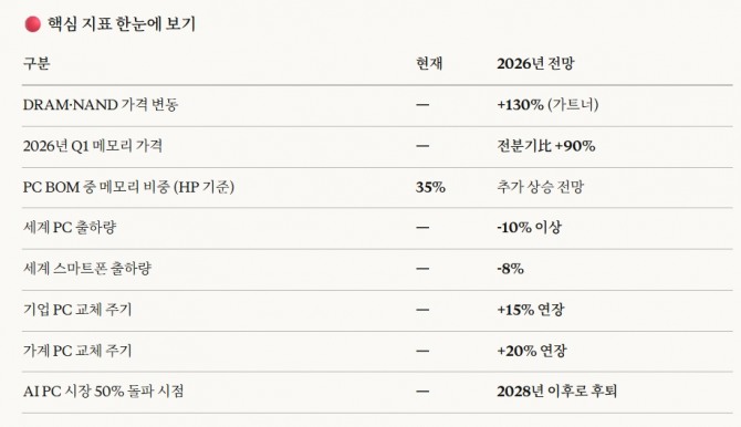 업계는 올해를 AI PC 대중화의 원년으로 기대했지만, 현실은 냉혹하다. 가트너는 가격 급등 충격으로 기업의 PC 교체주기가 15%, 일반 가계는 20% 늘어날 것으로 분석했다. 이에 AI PC 보급 확산은 2028년 이후로 미뤄지는 것이 불가피하다는 전망이 힘을 얻고 있다.