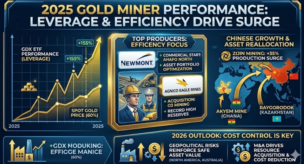 특히 뉴욕증시의 금광 지수 상장지수펀드(ETF)인 GDX가 한 해 동안 155% 폭등하며 금 현물 수익률(약 60%)을 두 배 이상 앞지른 점은 광산업계가 단순 채굴업을 넘어 고부가가치 금융 자산으로 재평가받았음을 시사한다.