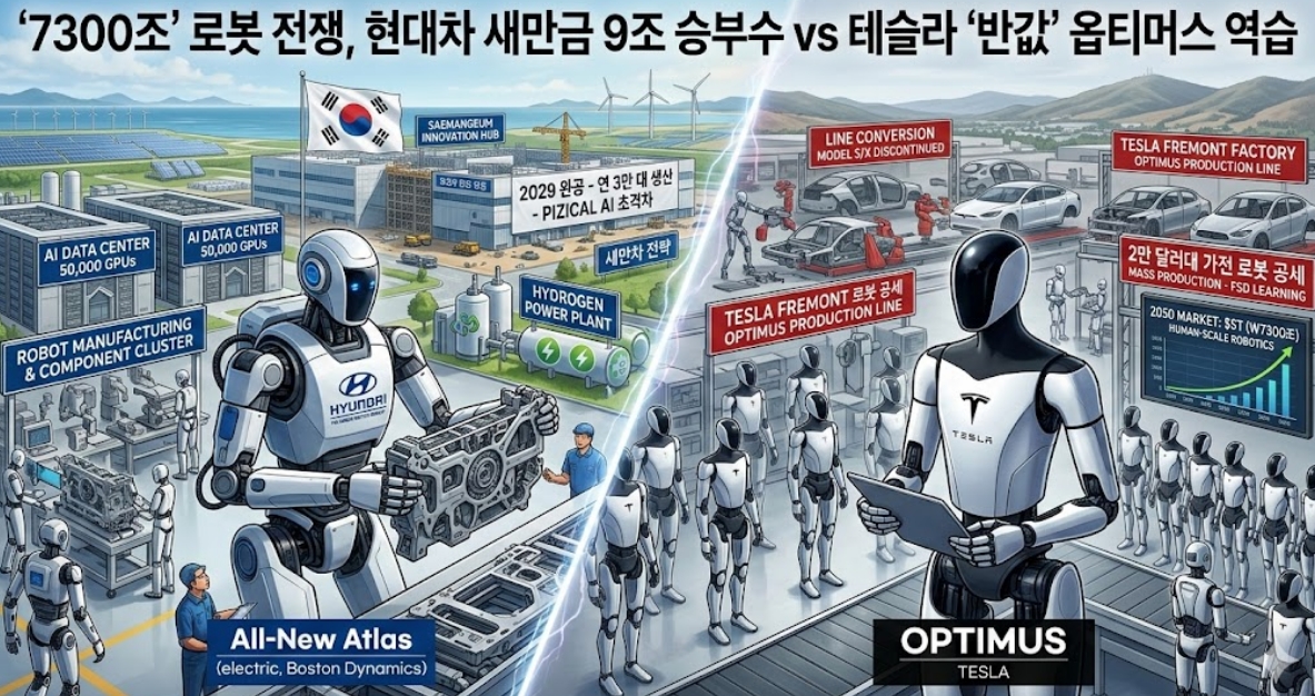 현대차는 새만금에 기가와트(GW)급 태양광 발전소와 수전해 플랜트를 함께 지어 로봇 가동에 필요한 에너지를 스스로 생산하는 'AI 수소 시티' 모델을 실증한다. 반면 테슬라는 거대 언어 모델(LLM)과 물리 지능을 결합한 소프트웨어 경쟁력에 집중하고 있다.