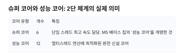 애플은 M5 Pro·Max의 18코어 CPU를 '슈퍼 코어' 6개와 '성능 코어' 12개로 구성했다. 두 유형의 코어는 역할이 명확하게 다르다. 슈퍼 코어 6개는 단일 작업 최고 속도를, 12개의 성능 코어는 멀티스레드 연산에 집중한다.