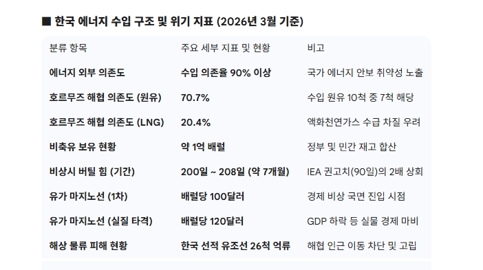 산업통상자원부에 따르면 정부는 2026년 3월 현재 약 1억 배럴의 전략 비축유를 보유하고 있다. 민간 재고까지 합산하면 200일에서 208일, 약 7개월분에 해당하는 양으로 국제에너지기구(IEA) 권고 기준인 90일을 두 배 이상 웃돈다. 에너지 전문가들은 국제 유가 배럴당 100달러를 1차 위기 국면으로, 120달러 선을 실질 경제 충격의 임계점으로 본다. 정부는 민간 재고가 급감할 경우 전국 9개 비축기지 물량을 즉각 방출할 준비를 마쳤다.