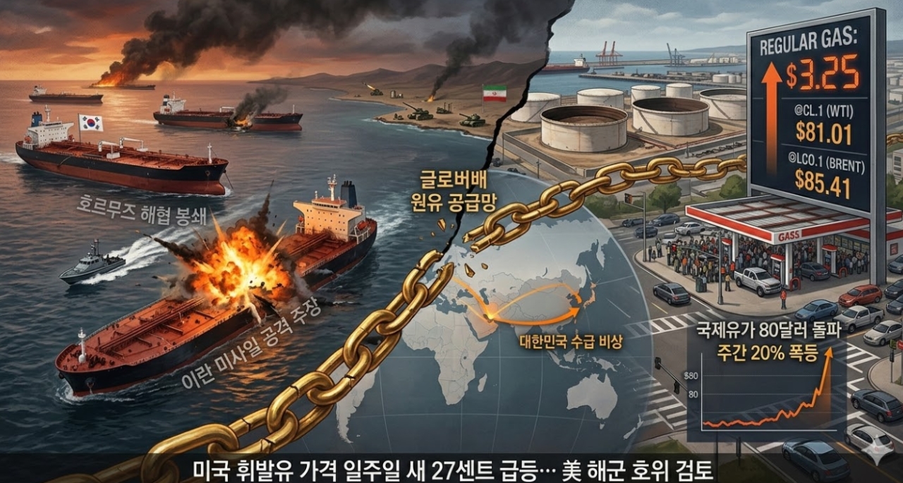 주간 기준으로는 약 20% 폭등이다. 이란과의 전쟁이 본격화된 지난주부터 산정하면, 시장은 단 5거래일 만에 2022년 러시아의 우크라이나 침공 때와 맞먹는 충격을 소화하고 있는 셈이다. CNBC는 5일 보도에서 미국 내 휘발유 소매가격이 일주일 새 갤런당 27센트 급등해 3.25달러(약 4800원)에 이르렀다고 전했다. 미국자동차협회(AAA)는 이번 상승 속도를 2022년 3월 우크라이나 침공 직후 휘발유 가격 급등과 나란히 놓으며 '에너지발 인플레이션 재점화'를 경고했다.