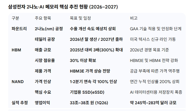 국내 자본시장의 한 전문가는 "삼성전자가 HBM과 첨단 파운드리에서 가시적인 성과를 내기 시작하면서 기업 가치에 대한 시장의 재평가 논의가 확산되고 있다"면서도 "공격적 가격 정책이 장기적으로는 경쟁사의 증산 의지를 자극하는 요인이 될 수 있다는 점을 함께 봐야 한다"고 말했다.